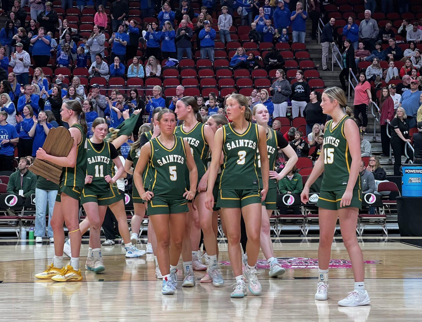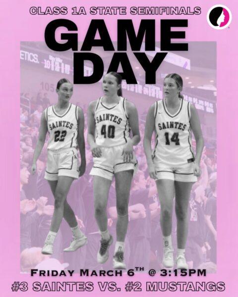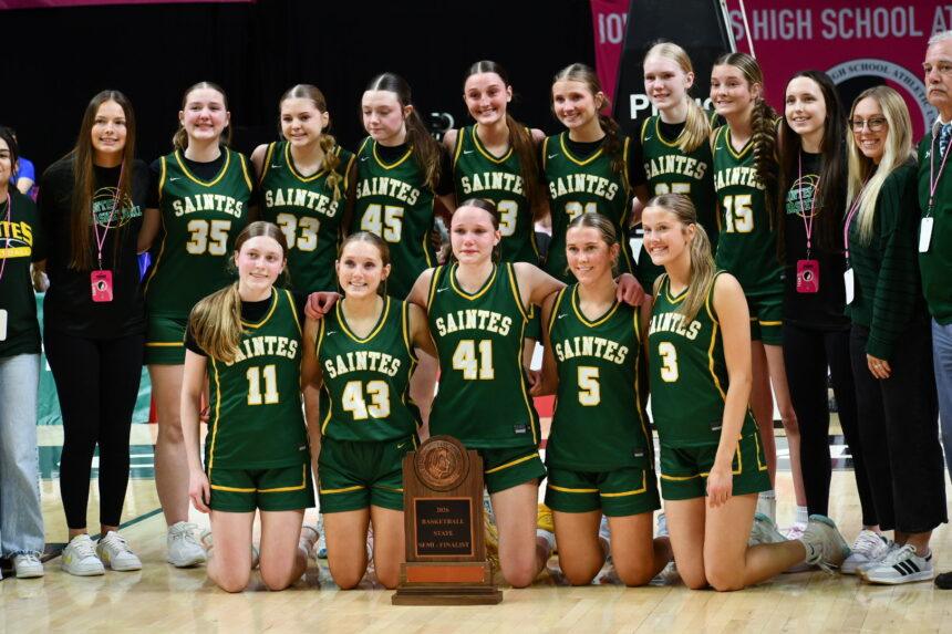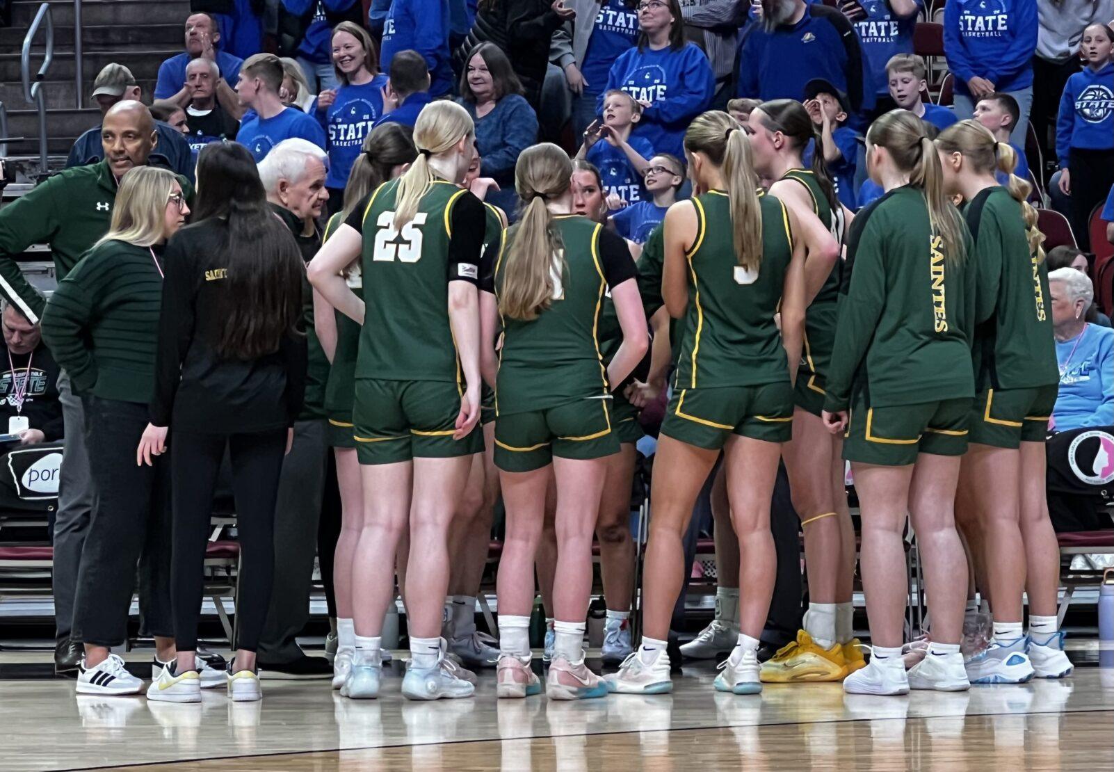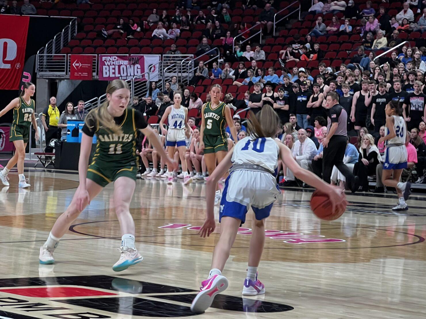 Saintes Basketball in the State Semifinals vs Newell-Fonda: The Saintes lost in a hard fought game, 50-45.