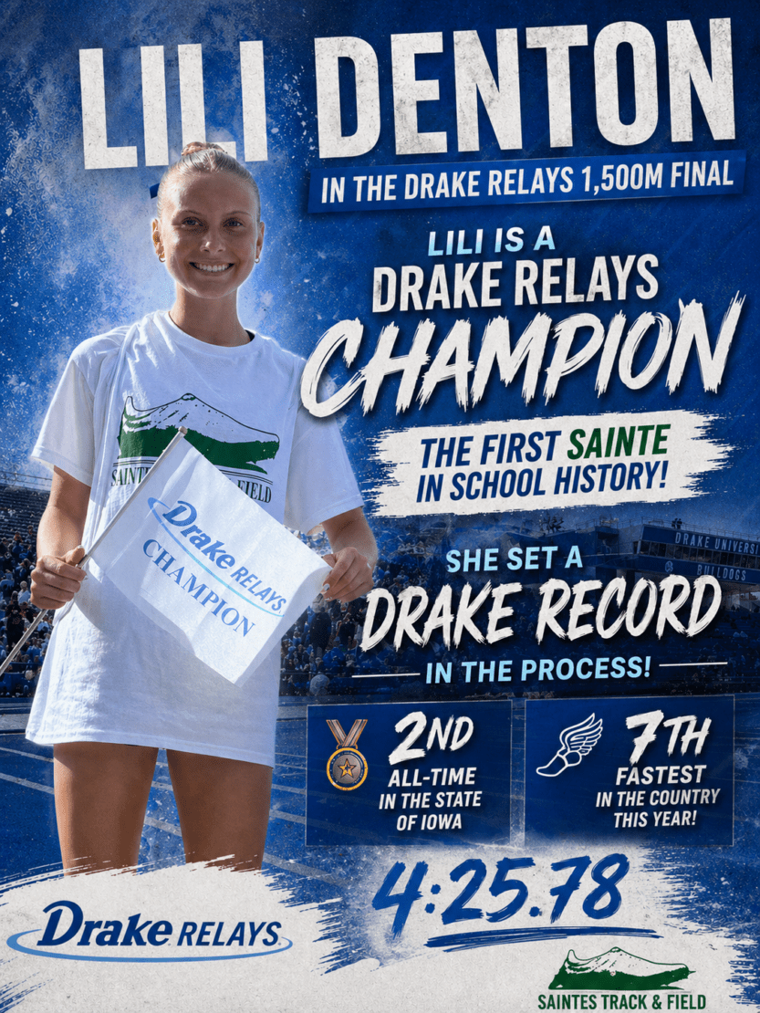 Lili Denton in the Drake Relays 1,500m Final: Lili is a Drake Relays Champion – the first Sainte in school history! She set at Drake Record in the process and her time is 2nd all-time in the state of Iowa and the 7th fastest in the country this year!!!
