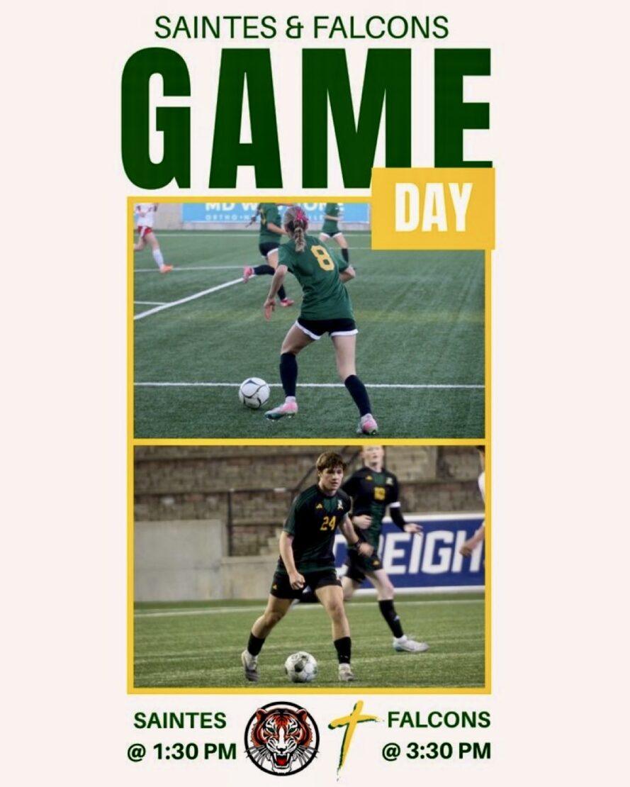 Saintes & Falcon Soccer at the TJ Soccer Border Battle: Saintes vs NE Class A #4 Elkhorn South at 8:30am and vs SC East at 1pm; Falcons vs S. Sioux City at 10am on West Grass and vs Sioux City East at 4pm on East Grass.